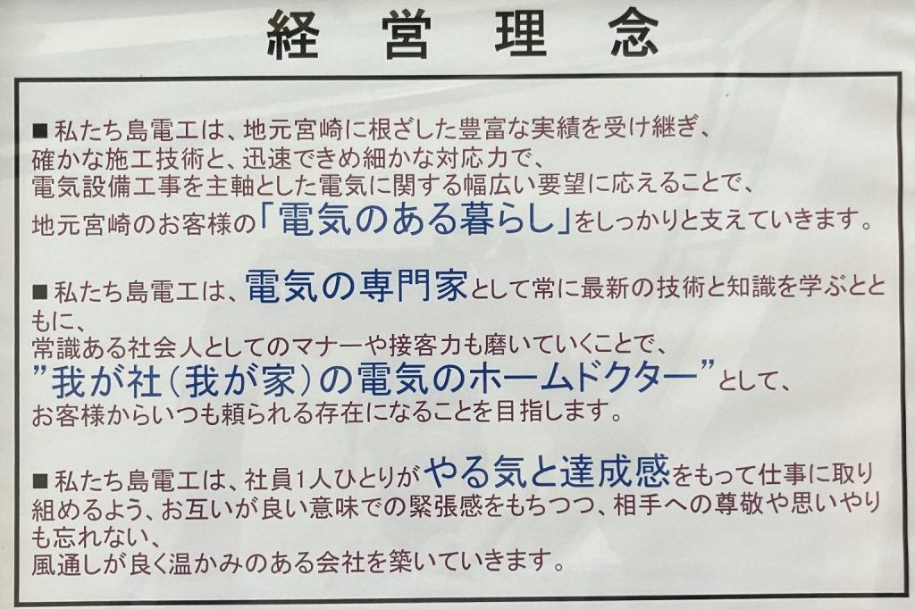 企業活動 経営理念 2025.09.19 私たち島電工は、電気のホームドクターとして、電気のある暮らしを電気の専門家として『やる気と達成感』を持って社員一丸となり取り組んで参ります。 みやざきシェイクアウト